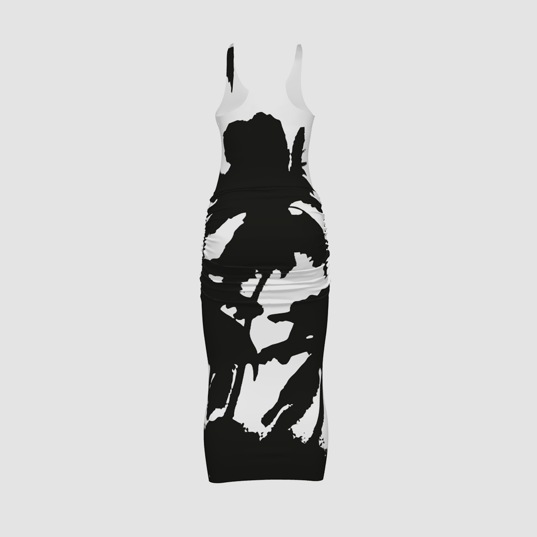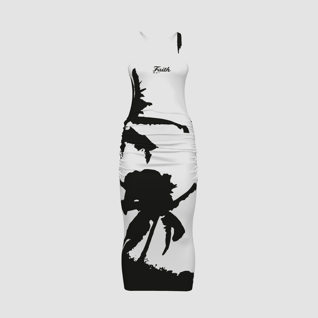 Sleeveless dress featuring a bold palm tree print and a "Faith" logo on the chest. Designed with a fitted silhouette for a sleek look.