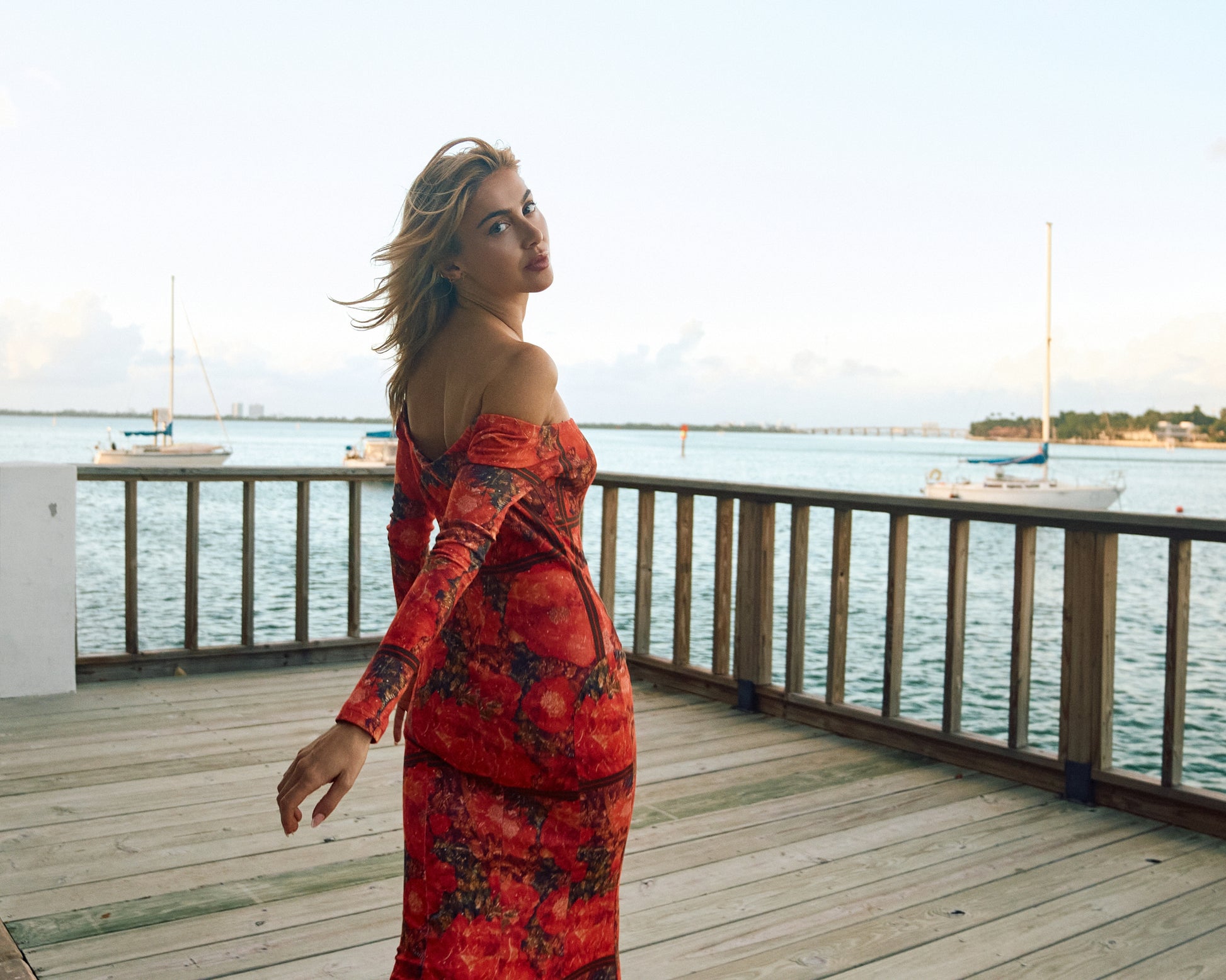 Off-shoulder bodycon dress in stretch cotton featuring a floral print and discreet FC monogram. Long sleeves and a form-fitting silhouette.