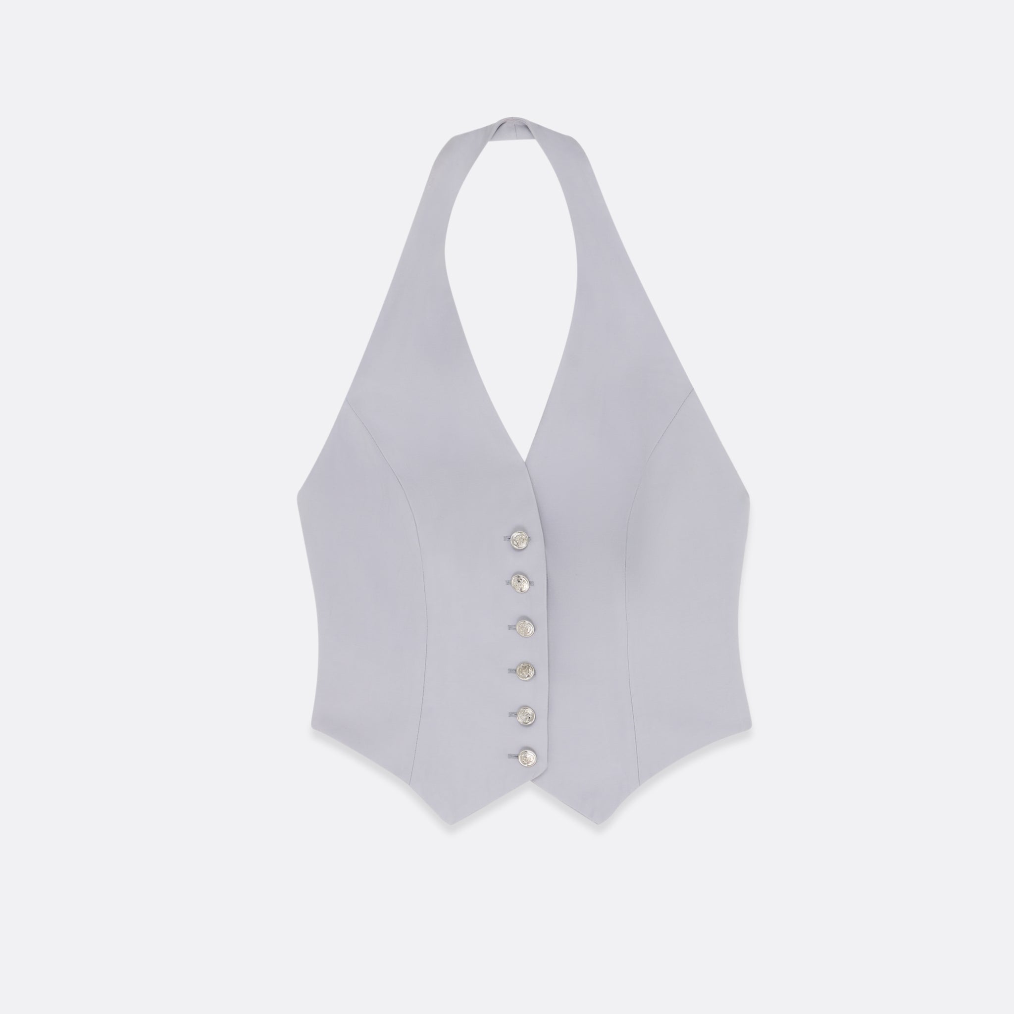 Tailored gilet with a halter neckline and pointed hem. Features a front button closure and an open back. The inside is finished with lining.