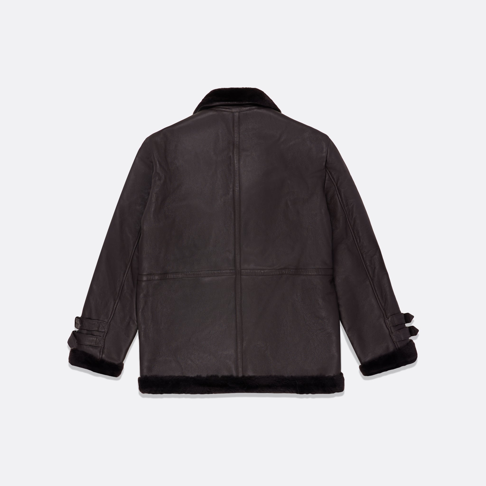Black shearling jacket with front zip closure, buckle cuffs, and zippered pockets. Shearling collar and lining.