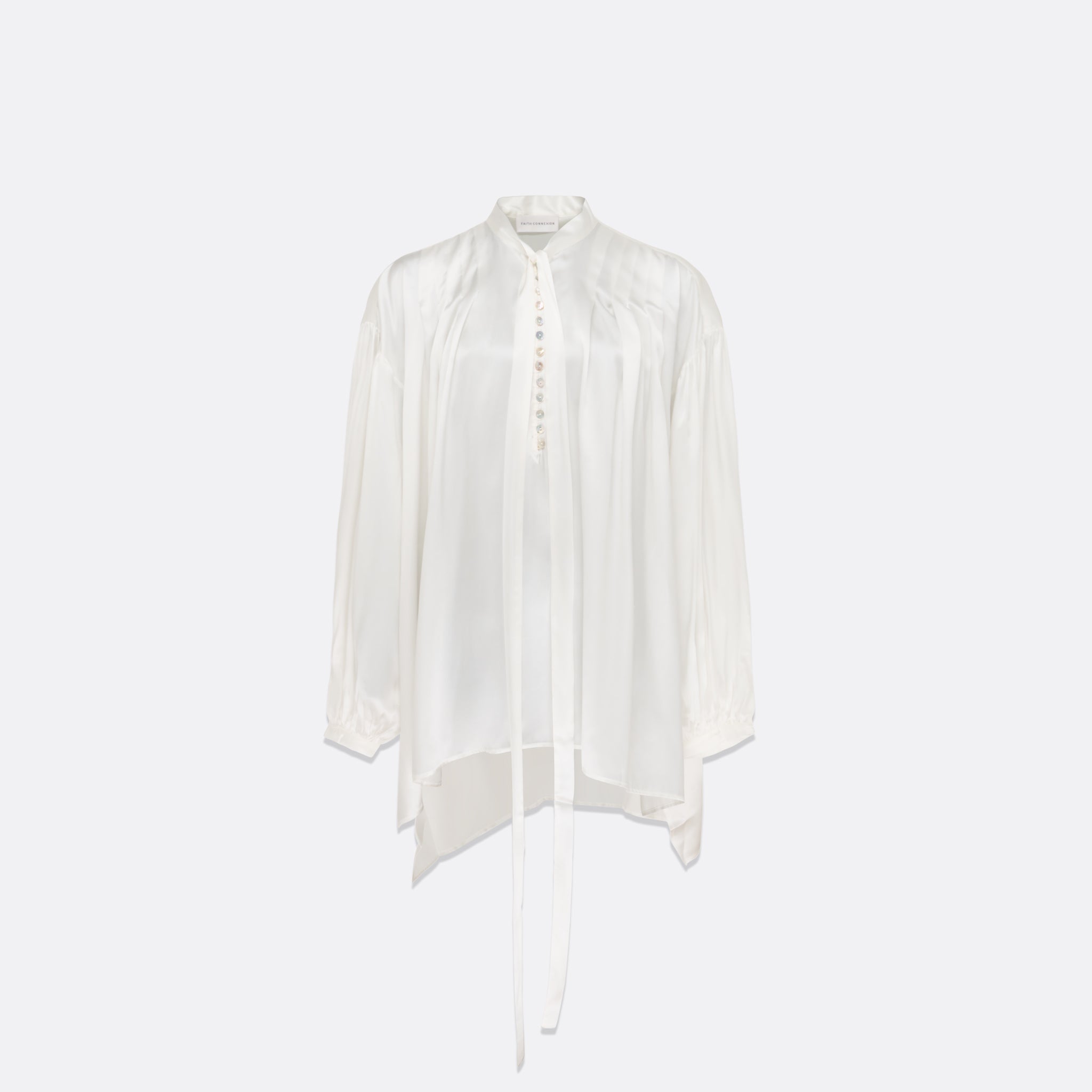 Loose-fit silk blouse with button closure and long sleeves.