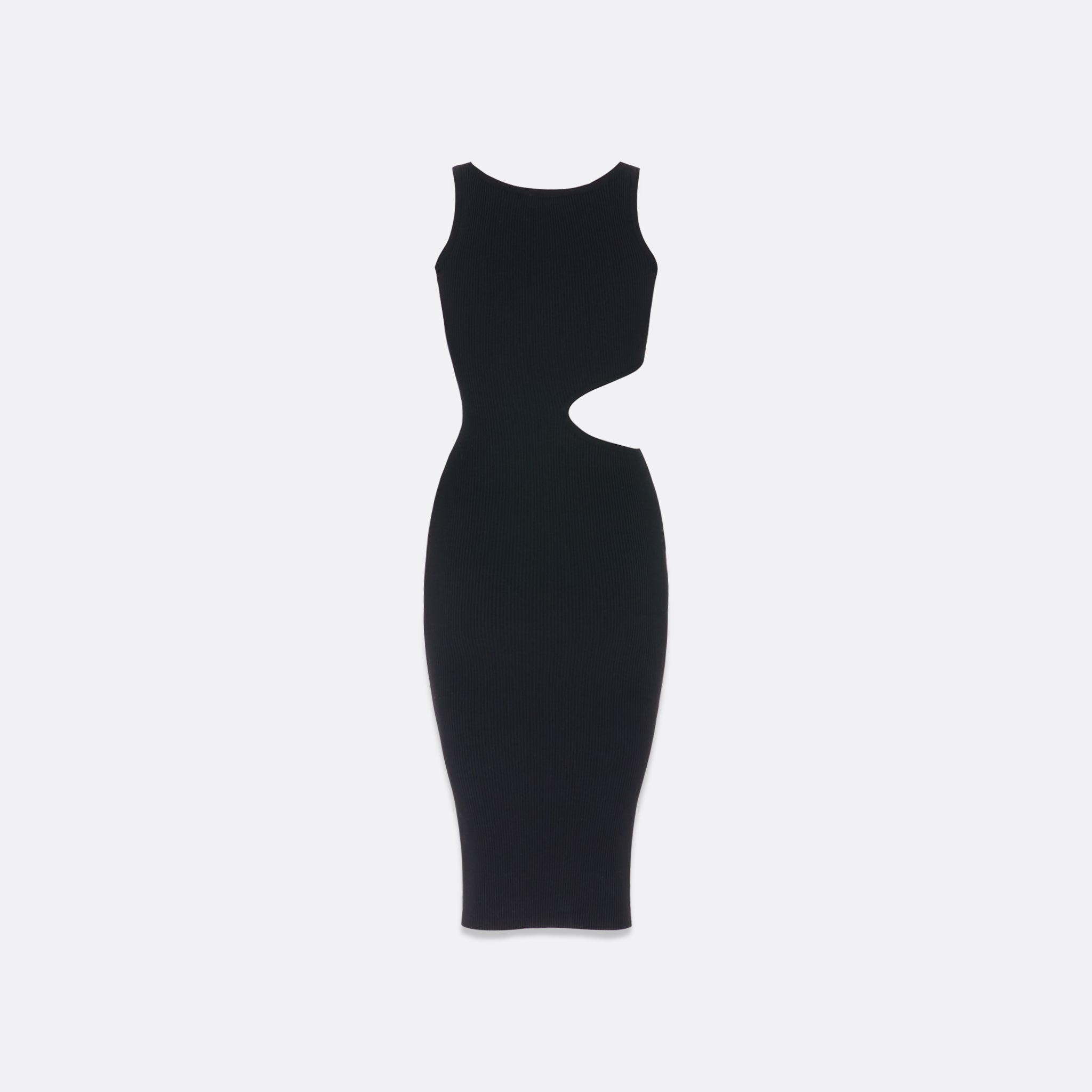 This cotton knitted dress features a fitted silhouette and a stylish cut-out detail on the side. Perfect for a chic and modern look.