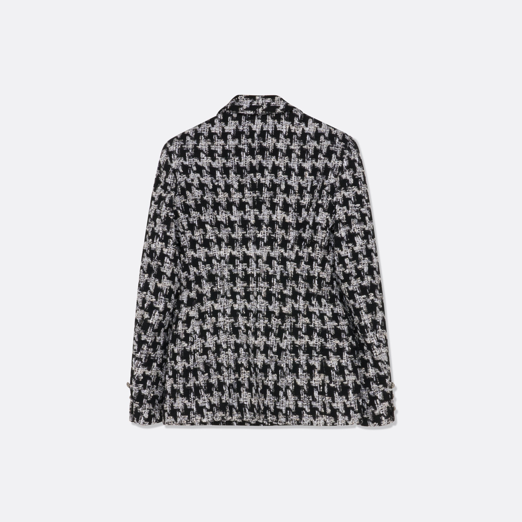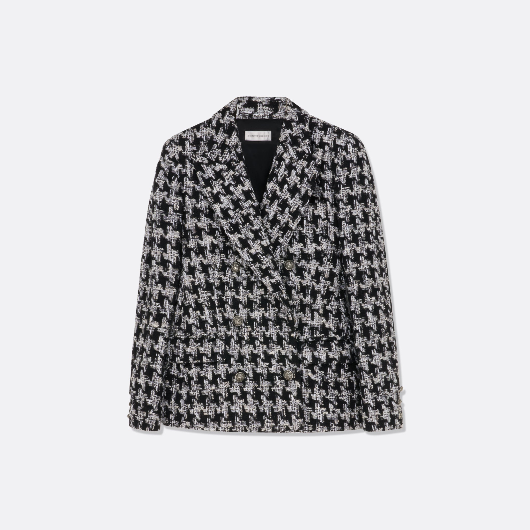 Tweed jacket with double-breasted closure, notched lapel, and front pockets.