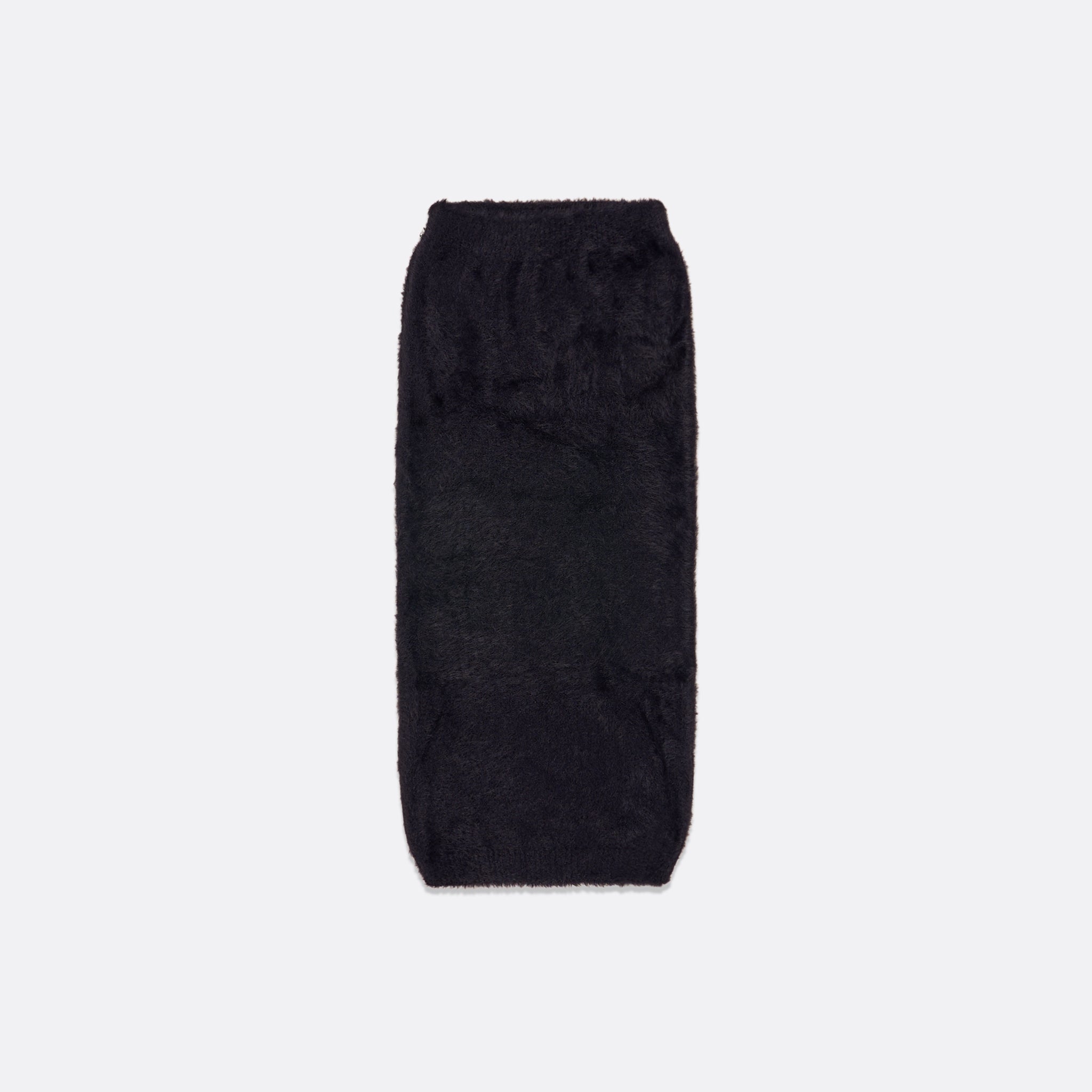 Mid-length pencil skirt made from soft, fuzzy knit fabric. Features a stretchy waistband for comfort and a slim fit.