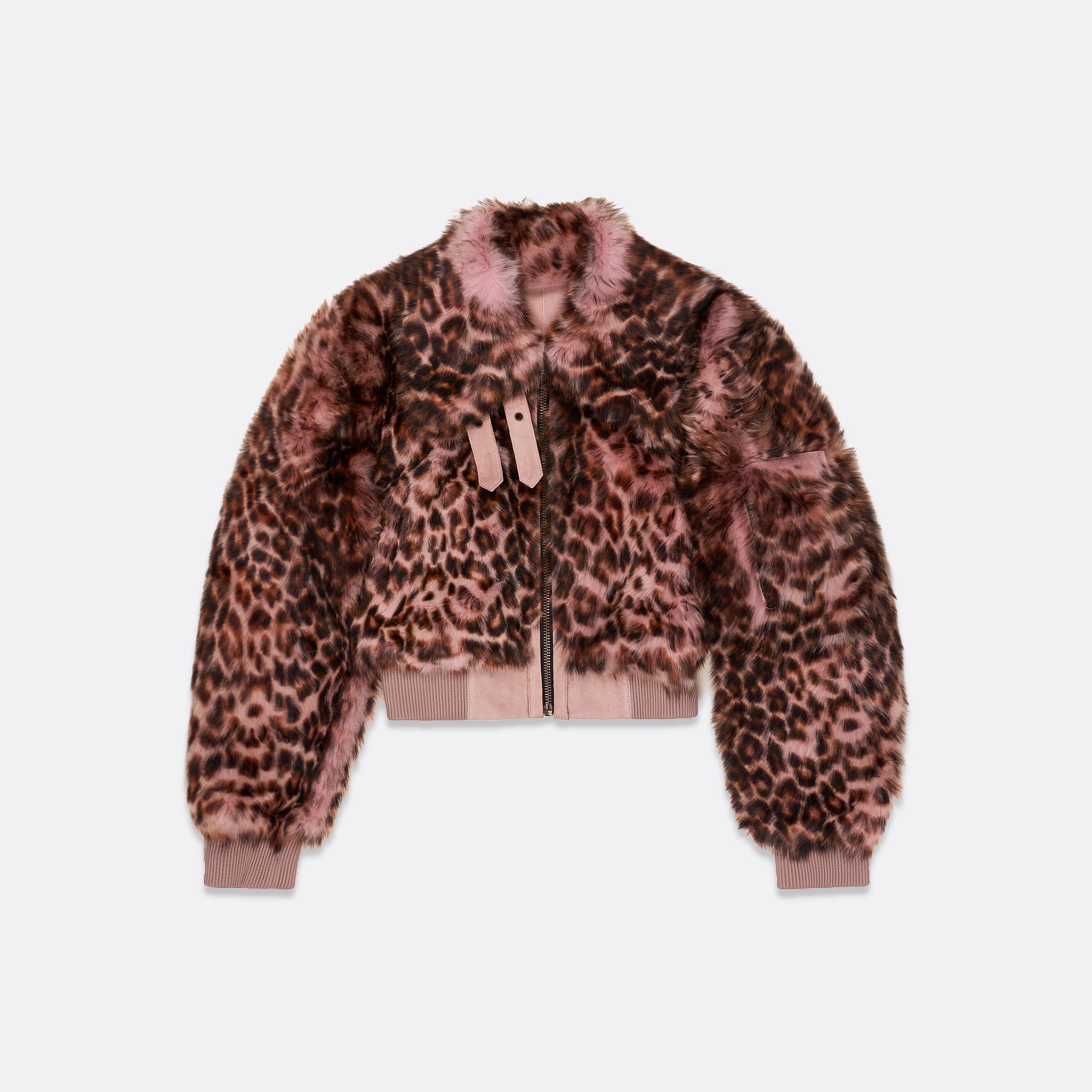 A cropped blouson crafted from real fur with a jaguar pattern in light pink. Features a front zip closure, ribbed cuffs, and waistband for a structured fit.