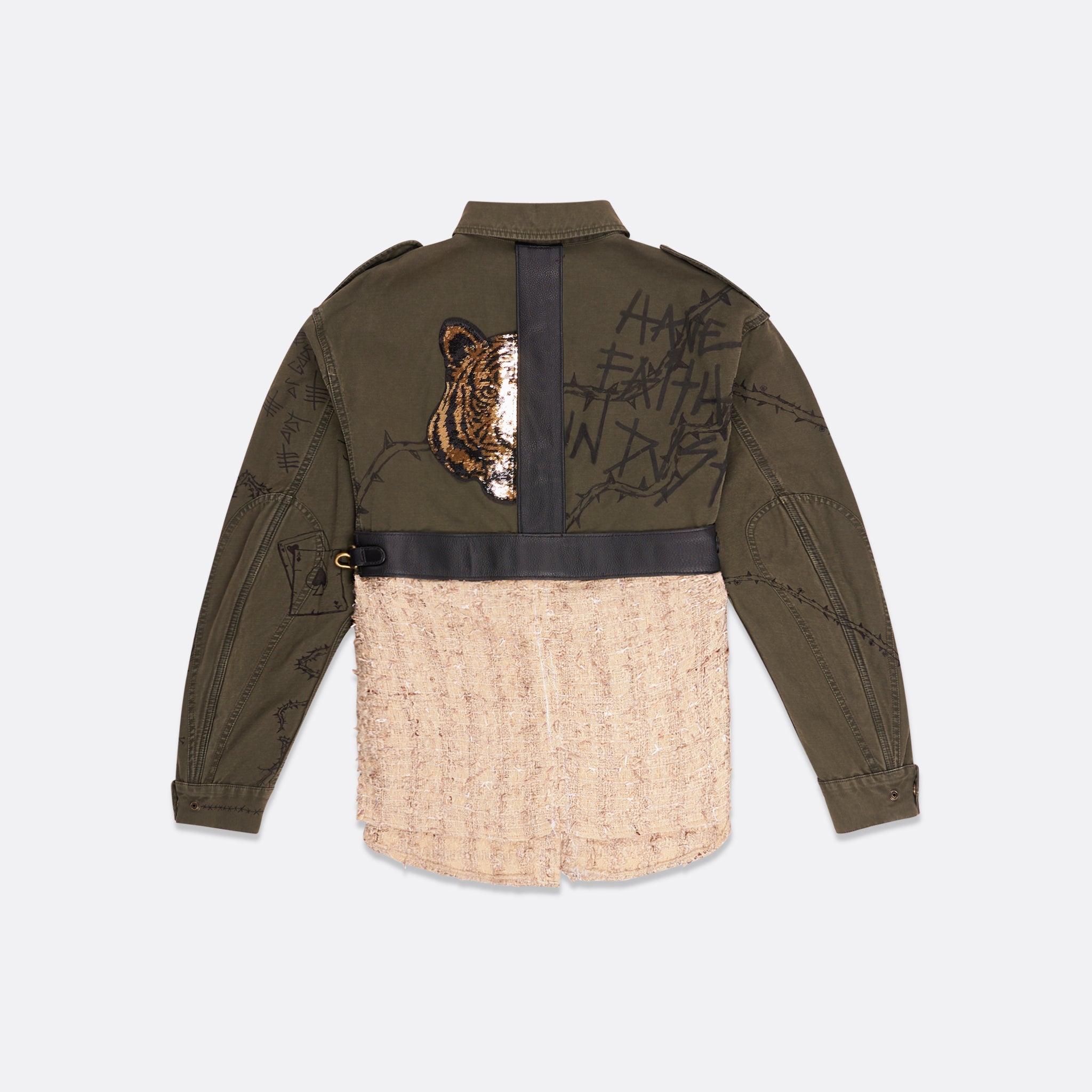 An upcycled piece blending the ruggedness of a classic parka with the elegance of tweed.