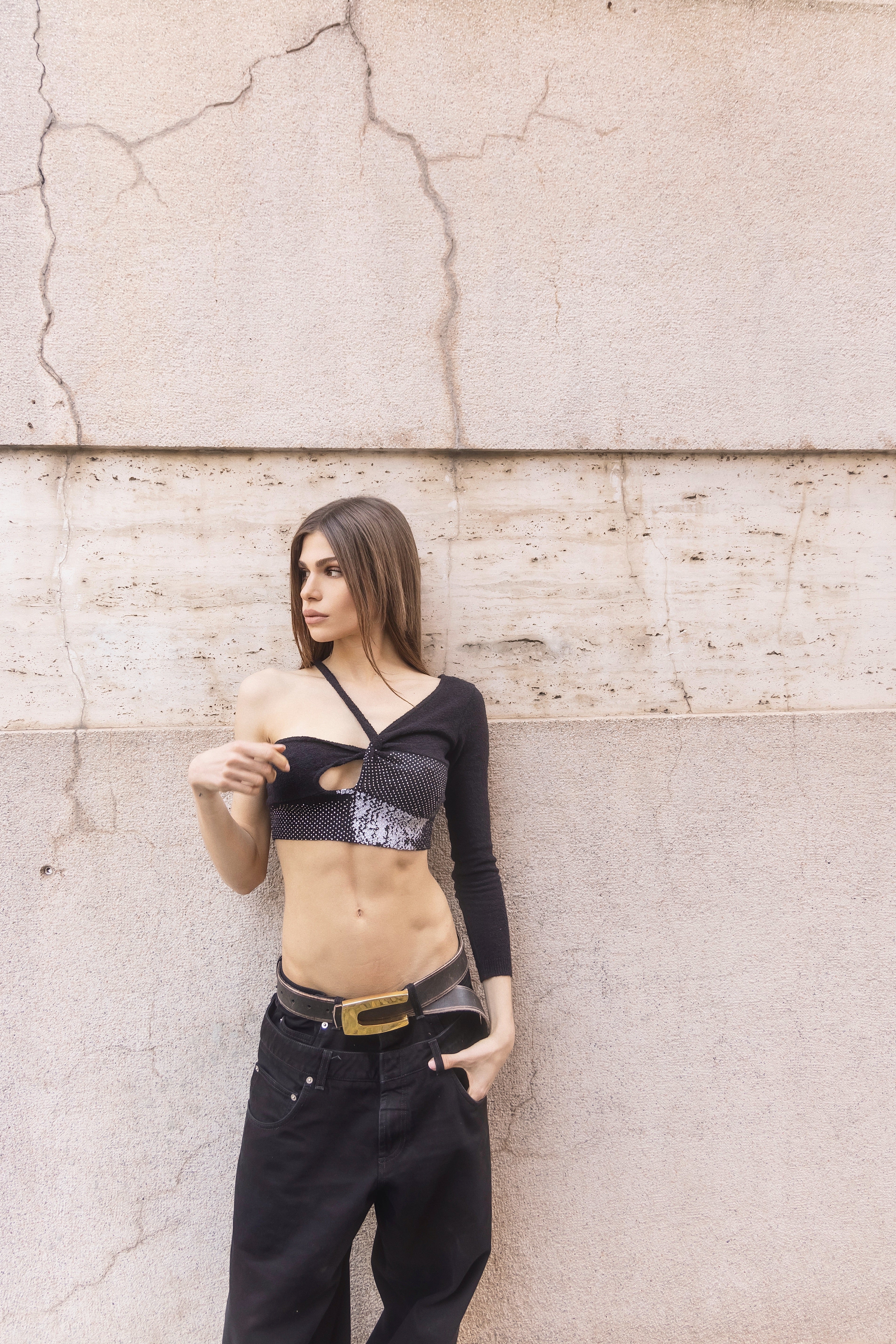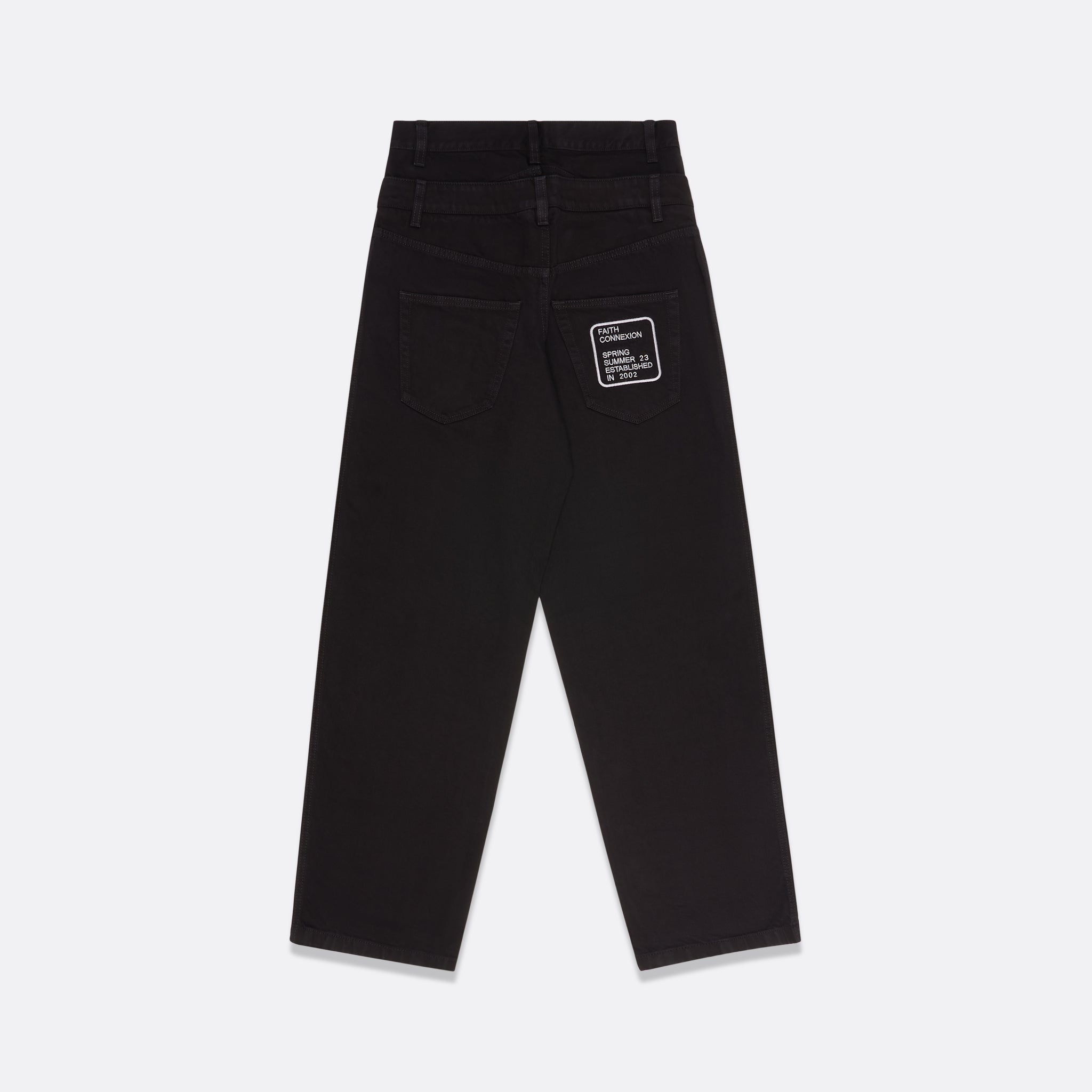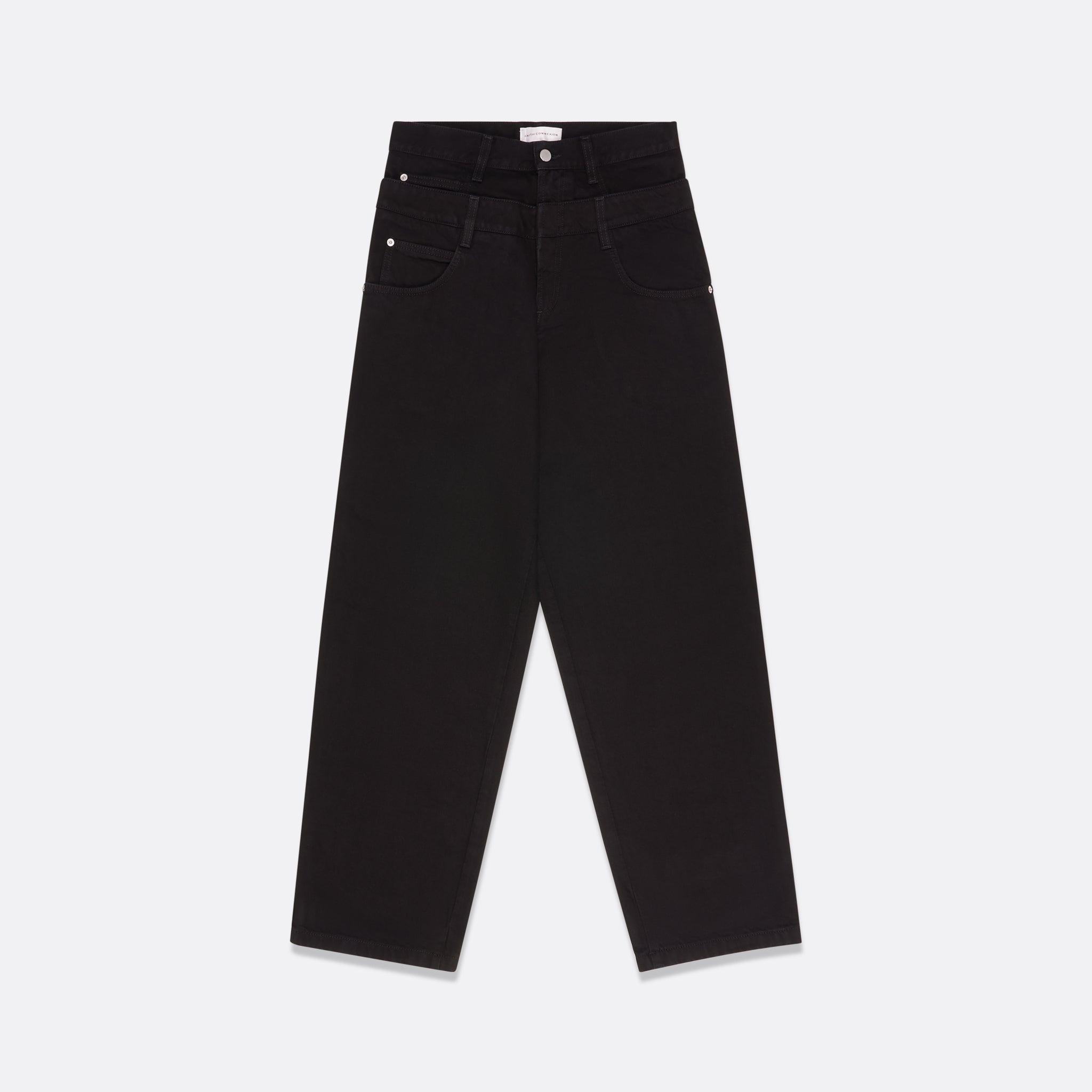 These women's denim pants feature a unique double belt design and a relaxed fit. Ideal for a modern and edgy look.